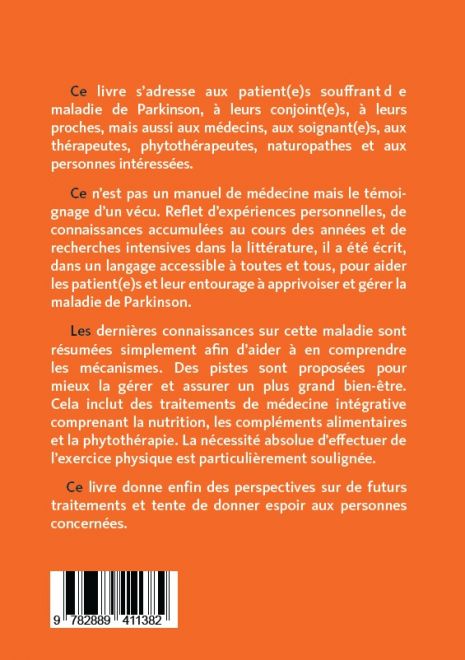 Ce livre s’adresse aux patient(e)s souffrant de maladie de Parkinson, à leurs conjoint(e)s, à leurs proches, mais aussi aux médecins, aux soignant(e)s, aux thérapeutes, phytothérapeutes, naturopathes et aux personnes intéressées.