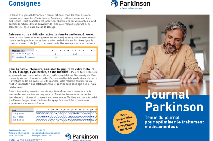 Utilisez le « Journal Parkinson » pour consigner par écrit ce que vous ressentez, vos symptômes et leur évolution pendant une semaine. Notez-y la qualité de votre mobilité, les éventuelles dyskinésies et spasmes.