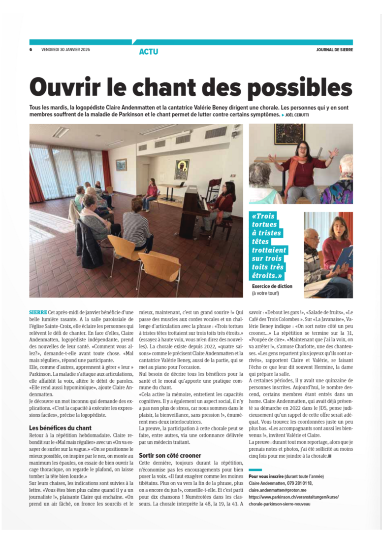 Cette chorale vise à pratiquer des exercices ciblés, ainsi qu’à interpréter un répertoire varié afin d’améliorer et de maintenir vos capacités vocales et respiratoires. Elle permet également d’entretenir le lien social.
