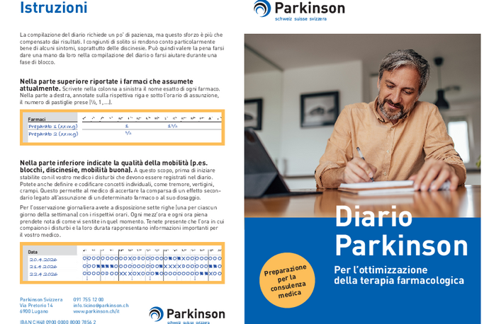Con l’ausilio del Diario Parkinson può prendere nota di come si sente, dei suoi sintomi e della loro evoluzione nel corso di una settimana. Nel diario annoti la qualità della mobilità, come pure l’eventuale comparsa di discinesie e di crampi.