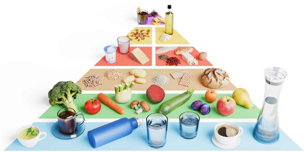 In der Pyramide werden die Lebensmittel in verschiedene Gruppen eingeteilt. Die Basis bilden zuckerfreie Getränke, darauf folgen Früchte und Gemüse, dann Getreideprodukte und Kartoffeln. Weiter oben folgen Milchprodukte, Hülsenfrüchte, Eier und Fleisch, danach Nüsse und Samen, Öle und Fette. Zuoberst sind Süssgetränke, Süsses und salzige Snacks aufgeführt.